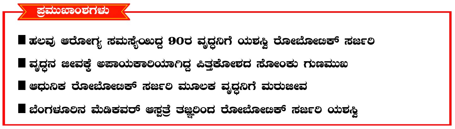 ಗಂಭೀರ ಆರೋಗ್ಯ ಸಮಸ್ಯೆಯಿಂದ ಪ್ರಾಣಾಪಾಯದಲ್ಲಿದ್ದ 90 ವರ್ಷದ ವೃದ್ಧರೊಬ್ಬರಿಗೆ ಮಾನವೀಯತೆ ಹಾಗೂ ಅತ್ಯಾಧುನಿಕ ವೈದ್ಯಕೀಯ ತಂತ್ರಜ್ಞಾನ ಸಹಾಯದಲ್ಲಿ ರೋಬೋಟಿಕ್ ಸರ್ಜರಿ ಮಾಡಿದ ಮೆಡಿಕವರ್ ಆಸ್ಪತ್ರೆಯ ವೈದ್ಯರು ಮರು ಜೀವ ನೀಡಿದ್ದಾರೆ.