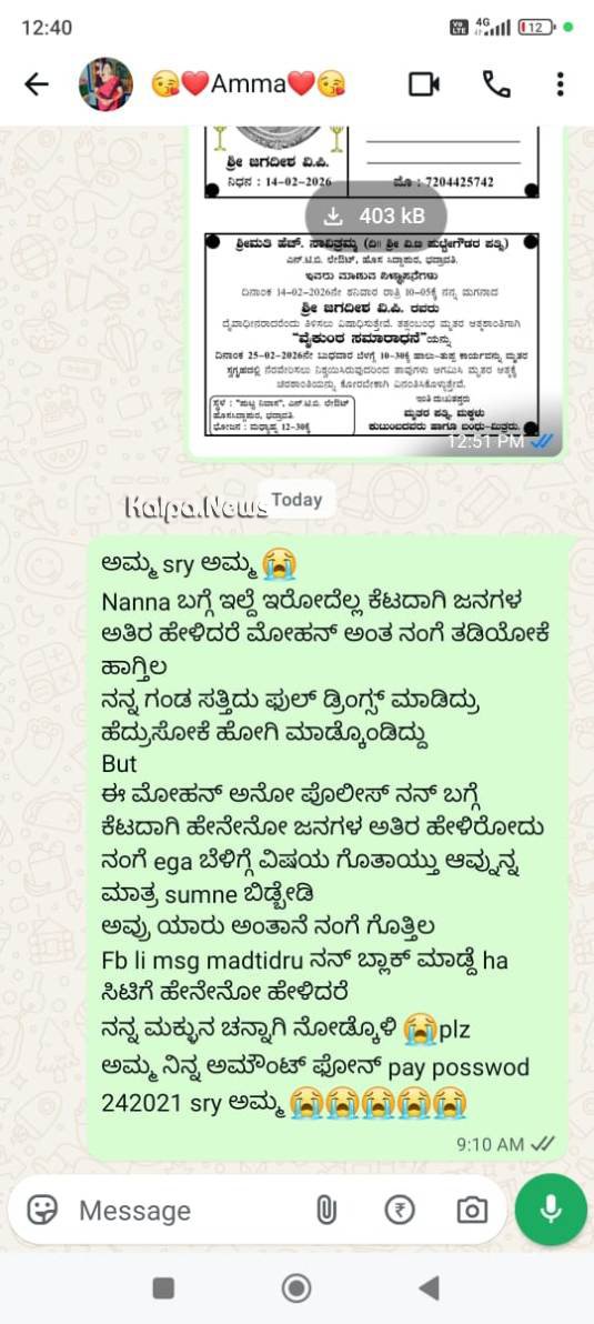 ಹೀಗಿರುವಾಗ ನನ್ನ ಅಳಿಯ ಪೋಲೀಸ್ ಇಲಾಖೆಯಲ್ಲಿ ಕೆಲಸ ಮಾಡುತ್ತಿದ್ದು ಕುಡಿಯವ ಚಟ ಕಲಿತಿದ್ದು ಇದಕ್ಕೆ ಕಾರಣ ನಮ್ಮ ಮಗಳ ಕುಟುಂಬದ ಬಗ್ಗೆ ಪೋಲೀಸ್ ಪೇದೆಯಾದ ಮೋಹನ್ ರವರು ಅಪಪ್ರಚಾರ ಮಾಡಿದ್ದು ಇದರಿಂದ ಮನ ನೊಂದು ನನ್ನ ಅಳಿಯ ದಿನಾಂಕ:14-02-2026ರAದು ರಾತ್ರಿ 9.30 ಗಂಟೆ ಸಮಯದಲ್ಲಿ ನೇಣು ಹಾಕಿಕೊಂಡು ಹೊಸ ಸಿದ್ದಾಪುರದಲ್ಲಿ ಮೃತರಾಗಿರುತ್ತಾರೆ.