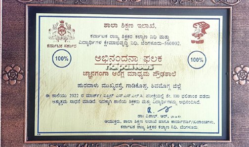 2022 – 23 ರ ಶೈಕ್ಷಣಿಕ ಸಾಲಿನಲ್ಲಿ ನಡೆದ ಎಸ್ ಎಸ್ ಎಲ್ ಸಿ ಪರೀಕ್ಷೆಯಲ್ಲಿ ನಗರದ ಗಾಡಿಕೊಪ್ಪದಲ್ಲಿರುವ ಜ್ಞಾನಗಂಗಾ ವಿದ್ಯಾಸಂಸ್ಥೆಯ ಆಂಗ್ಲ ಮಾಧ್ಯಮ ಪ್ರೌಢಶಾಲೆಯ ಎಲ್ಲಾ ವಿದ್ಯಾರ್ಥಿಗಳೂ ಉತ್ತಮ ಅಂಕಗಳನ್ನು ಪಡೆದು ಉತ್ತೀರ್ಣರಾಗಿರುವುದರಿಂದ ಶಾಲೆಗೆ ಶೇ.100% ಫಲಿತಾಂಶ ದಾಖಲಿಸಿದ್ದು, ಈ ಸಾಧನೆಯನ್ನು ಗುರುತಿಸಿ ಶಿಕ್ಷಣ ಇಲಾಖೆಯು ಅಭಿನಂದನೆಗಳನ್ನು ಸಲ್ಲಿಸುವ ಮೂಲಕ ನೆನಪಿನ ಗೌರವ ಸ್ಮರಣಿಕೆಯನ್ನು ನೀಡಿ ಗೌರವಿಸಿದೆ.
