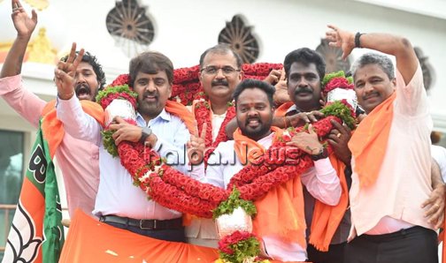 ಮೈಸೂರಿನಲ್ಲಿ ಮತ ಎಣಿಕೆ ನಡೆಸಲಾಗಿತ್ತು. ಗೆಲುವು ಸಾಧಿಸಿದ ಬಳಿಕ ಶುಕ್ರವಾರ ಸಂಜೆ ಡಾ. ಧನಂಜಯ ಸರ್ಜಿ ಶಿವಮೊಗ್ಗಕ್ಕೆ ಮರಳಿದರು. ನಗರಕ್ಕೆ ಆಗಮಿಸುತ್ತಿದ್ದಂತೆ ಬಿಜೆಪಿ ಕಾರ್ಯಕರ್ತರು ಡಾ. ಧನಂಜಯ ಸರ್ಜಿ ಅವರಿಗೆ ಹಾರ ಹಾಕಿ, ಪಟಾಕಿ ಸಿಡಿಸಿ, ಸಿಹಿ ಹಂಚಿ ಸ್ವಾಗತಿಸಿದರು. ಬೆಕ್ಕಿನಕಲ್ಮಠದ ಮುಂಭಾಗದಿಂದ ಬಿಜೆಪಿ ಕಚೇರಿವರೆಗೆ ತೆರೆದ ವಾಹನದಲ್ಲಿ ಮೆರವಣಿಗೆ ನಡೆಸಲಾಯಿತು.