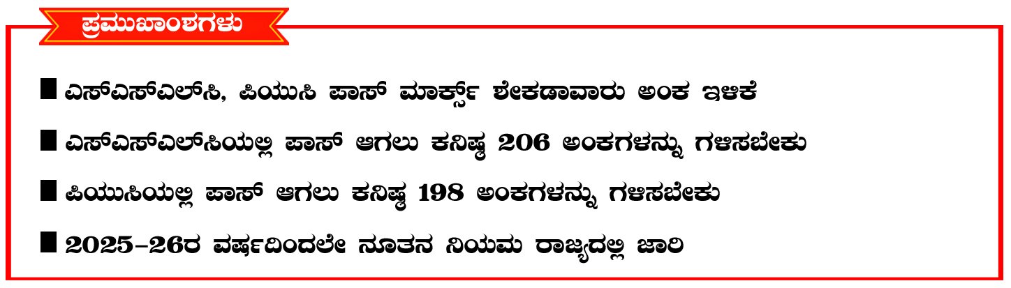 ಎಸ್’ಎಸ್’ಎಲ್’ಸಿ ವಿದ್ಯಾರ್ಥಿಗಳಿಗೆ ಹಾಲಿ ಉತ್ತೀರ್ಣರಾಗಲು 625 ಅಂಕಗಳಿಗೆ ಕನಿಷ್ಟ ಶೇ. 35ರಷ್ಟು (219 ಅಂಕಗಳು) ಗಳಿಸುವುದು ಕಡ್ಡಾಯವಿತ್ತು. ಹೊಸ ನಿಯಮದ ಪ್ರಕಾರ, 625 ಅಂಕಗಳಿಗೆ ಕನಿಷ್ಟ 206 ಅಂಕ (ಶೇ.33) ಗಳಿಸಿದರೆ ವಿದ್ಯಾರ್ಥಿಗಳು ಉತ್ತೀರ್ಣರಾಗುತ್ತಾರೆ. ಅಂದರೆ, ಪ್ರತಿ ವಿಷಯದಲ್ಲಿ ಕಡ್ಡಾಯವಾಗಿ ಕನಿಷ್ಠ 30 ಅಂಕ ಪಡೆಯಲೇಬೇಕಾಗುತ್ತದೆ.