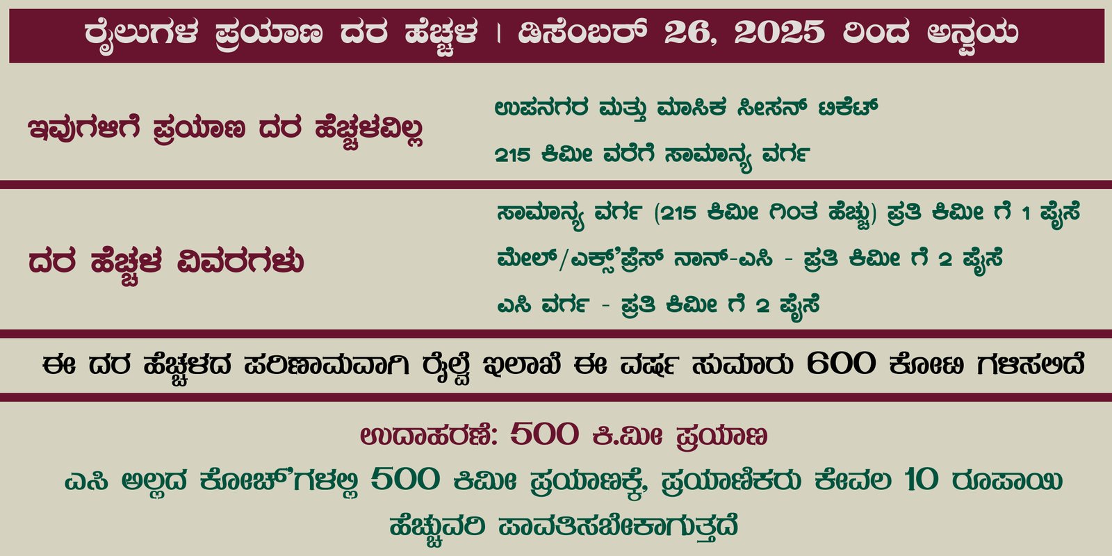 ಭಾರತೀಯ ರೈಲ್ವೆ ಪ್ರಯಾಣ ದರವನ್ನು ಏರಿಕೆ ಮಾಡಿದ್ದು, ನೂತನ ದರ ಡಿಸೆಂಬರ್ 26ರಿಂದ ಅನ್ವಯವಾಗುತ್ತದೆ.